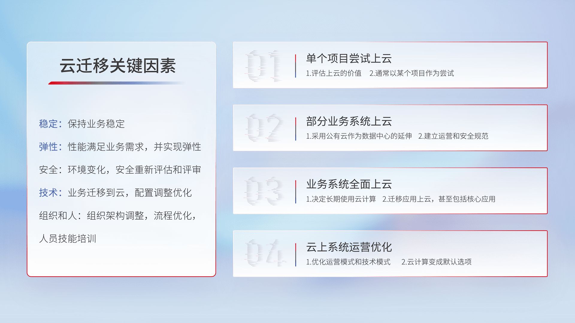 结合实际业务,,,从规划设计、、、云平台选型、、、、云原生改造、、数据迁移、、、、集成交付,,,,迁移全过程为客户识别最佳上云路径,,,,做好风险识别管理,,,,设计网络架构、、身份权限、、安全审计合规、、、、操作审计、、、日志审计、、、、监控告警策略、、、多站点容灾设计等,,对云上基础设施进行整体规划,,,,提升IT治理水平,,,,以满足弹性、、高可用、、、、高性能的需求。。