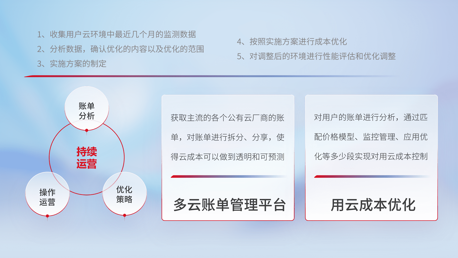 通过多云纳管,,,以统一的资源数据模型把客户的云资源进行抽象和封装,,进而实现对多云资源的统一操作,,保障云资源管理的可靠性、、稳定性与可用性。。。。量身定制化运维内容,,,,配置、、开发运维、、补丁管理、、备份、、监控、、认证和访问管理、、审计和日常巡检等,,,,保障在用云过程中的可靠度,,,稳定度以及高可用率。。。。